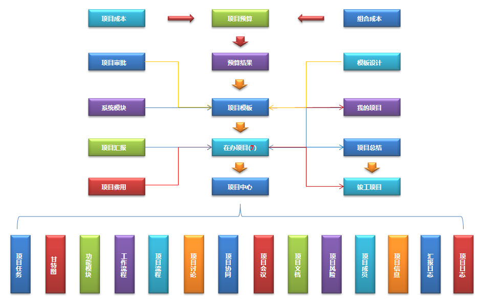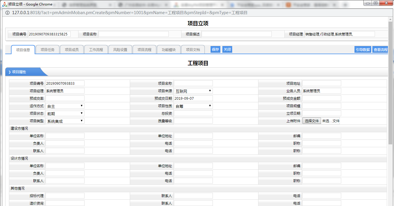 1)、项目名称:首先我们要输入该项目的名称 2)、项目描述:对此项目进行详细的一个描述 3)、项目经理:表示此项目是由哪个项目经理来进行负责,可以是一个也可以是多个项目经理,默认他会调用项目模板里面设置的项目经理,当然我们在遇到实际项目过程中可能项目经理有变化,那么我们可以在这里进行直接修改 4)、项目信息:不同的项目有不同的表单,那么这里的项目信息就是我们在项目模板设计的项目的表单,那么我们在这里就可以直接填写相应表单对应的数据,就表示项目的所在的信息数据 5)、项目任务:表示该项目在执行项目过程中有哪些任务进行汇报,默认情况会调用项目模板设计的项目任务,如果在这里有权限修改的话,我们也可以进行修改,如果没有权限修改的话就可以不用管他 6)、项目成员:表示该项目有哪些成员组成?默认情况下也是调用项目模板设计的项目成员,当然有权限修改的话,也可以进行修改,主要取决于模板的设置 7)、工作流程:工作流程主要是设置工作流程的审批入口,在项目中心里面直接点击该流程审批,就可以直接打开流程审批,这样更方便用户的操作;这里默认也是调用模板设计里面的工作流程的设计,当然如果有权限修改,也可以进行修改 8)、风险设置:设置项目管理过程中,可能遇到哪些风险?进行一个提示,在项目管理中心中一年就可以看到风险的程度,默认也是调用项目模板风险设计,如果有权限修改的也可以进行修改 9)、项目流程:用图形直观表示该项目的流程图,在项目管理过程中,也可以看到流程图哪些有执行,哪些未执行,哪些执行完成了?直观明了的显示出来,默认也是调用项目模板的项目流程,如果有权限修改的也可以进行修改 10)、功能模块:就是设计该项目管理过程中需要用到的哪些功能模块?这样在项目管理过程中,可以在项目中心直接使用该模块,这样就大大增加了用户的操作方便性,提高工作效率,默认也是调用项目模板设计中的功能模块,如果有权限修改也可以进行修改 11)、项目文档:就是我们在项目立项时,关于此项目有哪些文档,我们可以在这里进行一个上传,上传之后,其他的项目成员要了解该项目,也可以直接下载该项目文档中的文件,更集中的展现该项目的全体情况 12)、引导数据:主要领导工作流程审批的项目立项数据,或者系统模块,直接转入项目立项的数据,不管从哪里来的数据,点击立项以后都会打开此项目立项的表单数据 13)、查看流程:查看项目立项的流程,这个流程的设计是在系统流程里面进行设计的,而不是项目流程图,跟引道数据是相关联的,也就是在功能模块设计中的系统流程的设计 总结,项目立项主要是针对某个项目进行一个立项,填写项目的相关信息,有项目名称项目,表单的数据,同时也可以设计该项目的成员,工作流程,风险设置等等,主要是设计该项目管理过程中需要牵涉到哪些数据?那么立项以后,其他的项目成员在项目中心里面就可以直观明了的看到,以及汇报项目的任务,集中展现项目整个信息的设计 2、我的项目:我的项目,表示我立项的项目,如果在项目模板里面进行立项后,有些地方没有修改到的,那么可以在我的项目里面再可以进行一个修改,设计。打开的界面跟项目立项是一样的,也相当于功能模块中的修改。但这里显示的是自己立项的,或者项目管理中项目经理有自己的,或者监控有自己的,在这里就可以看到,没有的就看不到。 3、在办项目:在办项目是项目管理中的核心模块,也就是所有项目正在处理过程中,都在这里进行集中显示,那么在办项目只能是项目成员,项目经理,项目立项的人员才能够看到关于自己的项目,没有关于到自己的项目的话,在这里是看不到的