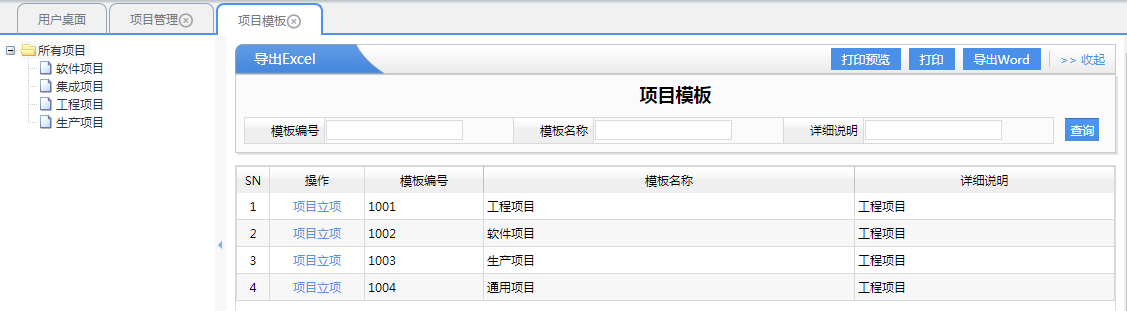 1、项目模板: 项目模板是项目立项的入口,每个项目立项都从项目模板进行入口,不同的项目选择不同的模板进行立项,模板的设计建项目模板设计里面进行详细描述