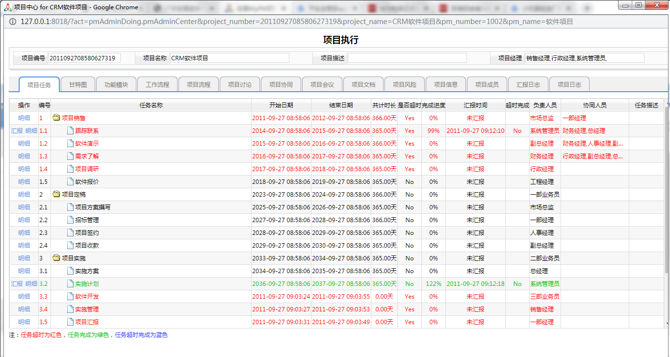 1)、项目任务:这里可以直观看到所有项目的任务的完成情况,如果是黑色的,表示还未完成,如果是红色的,表示已经超时,如果是绿色的,表示该任务已经完成了; 如果任务有下级任务,可以点击上级任务,那么就可以关闭下级任务,再点一次就可以打开下级任务; 这里也可以看到每一个任务的开始时间和结束时间,是否有超时?完成进度,也就是用百分比来表示,有没有进行汇报?最后是谁汇报的?最后汇报时间是多少?都可以清楚的看到;超时完成,如果该项目已经完成了,但是已经超过了任务完成时间,那么就显示超时完成 如果该任务是自己负责的,或者协同人员有自己的,那么该任务前面就有一个汇报,点击汇报就可以进行任务的汇报了,如果不是,那么只有明细,点击明细就可以看到汇报的情况