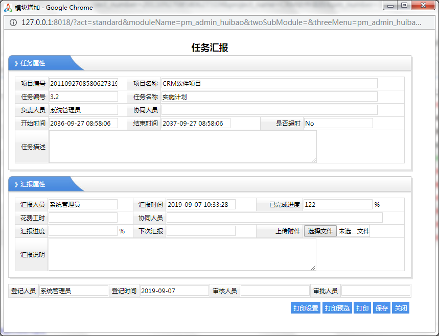 这里也是一个任务汇报的标准处理模块,上面显示该任务的具体情况,下面是汇报任务的详细情况,按照表单的信息进行填写,但这里需要注意的是汇报进度不是现在汇报的进度,是该任务完成的总的进度,比如说第1次汇报完成10%,那么表示该任务已经完成了10%,如果第2次汇报又完成了10%,那么任务汇报的话就要我写20%,因为表示该任务总的完成进度是20%,依次类推,汇报的情况可以在汇报说明里面进行填写,如果还有其他需要说明的,可以用文件上传进行说明;下次汇报,可以提醒的,我下次需要汇报,是一个提醒窗口的设置,打开明细就可以看到汇报的情况