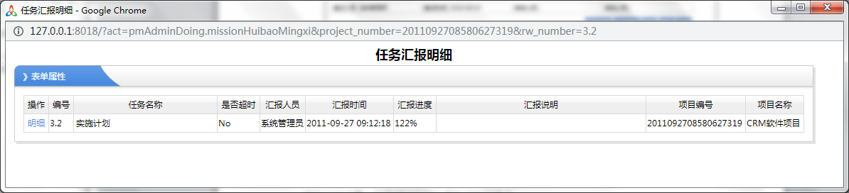 当然再打开里面的明细,可以看到具体的汇报的内容,这里只是做查看不用做任何的其他操作。 2)、甘特图 在项目执行过程中,甘特族是非常直观看到项目的每个任务的进度的一种表现形式,那么在这里面就可以看到那个项目的完成进度,如下图所示
