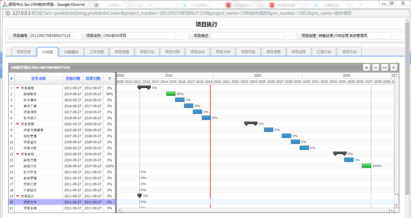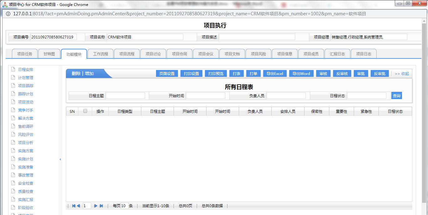 这里需要注意的是,甘特图是一个flash插件,浏览器需要允许flash,还要安装flash player,这里不用做其他的操作,只是查看就可以了 3)、功能模块: 功能模块就是我们在系统开发中遇到的功能模块,那么在这里主要是方便用户的操作以及查看,我们在这里面添加了该项目的内容,那么该对应的模块也只能显示该项目的内容,这样更清楚的看到每个功能模块中关于此项目的数据,要添加修改删除,都是在这里面进行,大大提高了操作的便利性,从而提高工作效率,增加用户的体验感!每个功能模块的操作跟其他系统的功能模块操作是一样的,只是每次添加的时候,它会自动带出该项目的项目编号,项目名称的观点数据