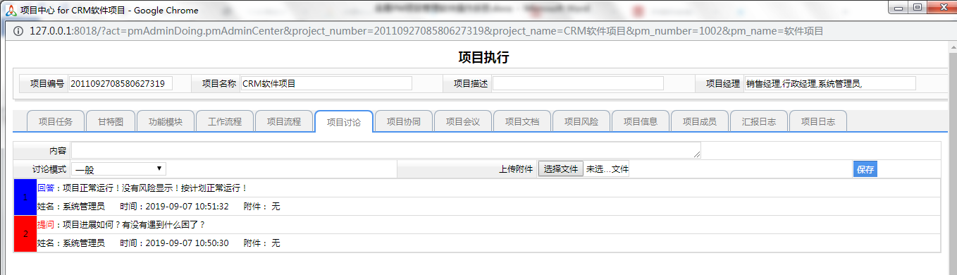 6)、项目讨论 项目讨论是在项目过程中,经常遇到一些问题,我们可以在这里面进行讨论,类似一个BBS,我们可以在这里面提问回复,上传一些相关的信息