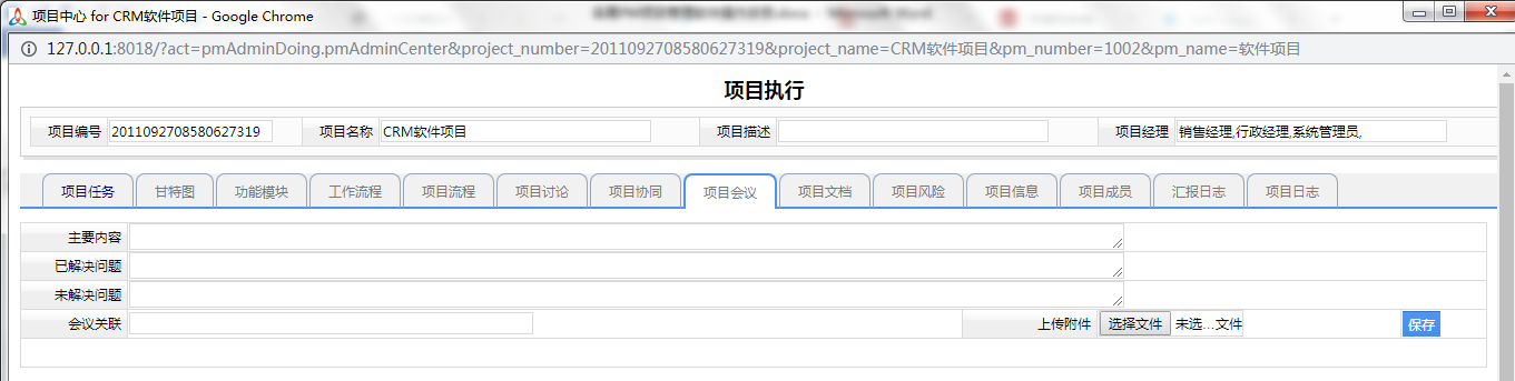 8)、项目会议 关于此项目实施过程中,可能会产生一些开会,那么这里主要是进入会议的摘要,那么在项目中心中呢,也可以集中体现出,通过会议能够解决哪些问题?共同协商讨论哪些问题,这里一个详细记录,从而把控项目的状态