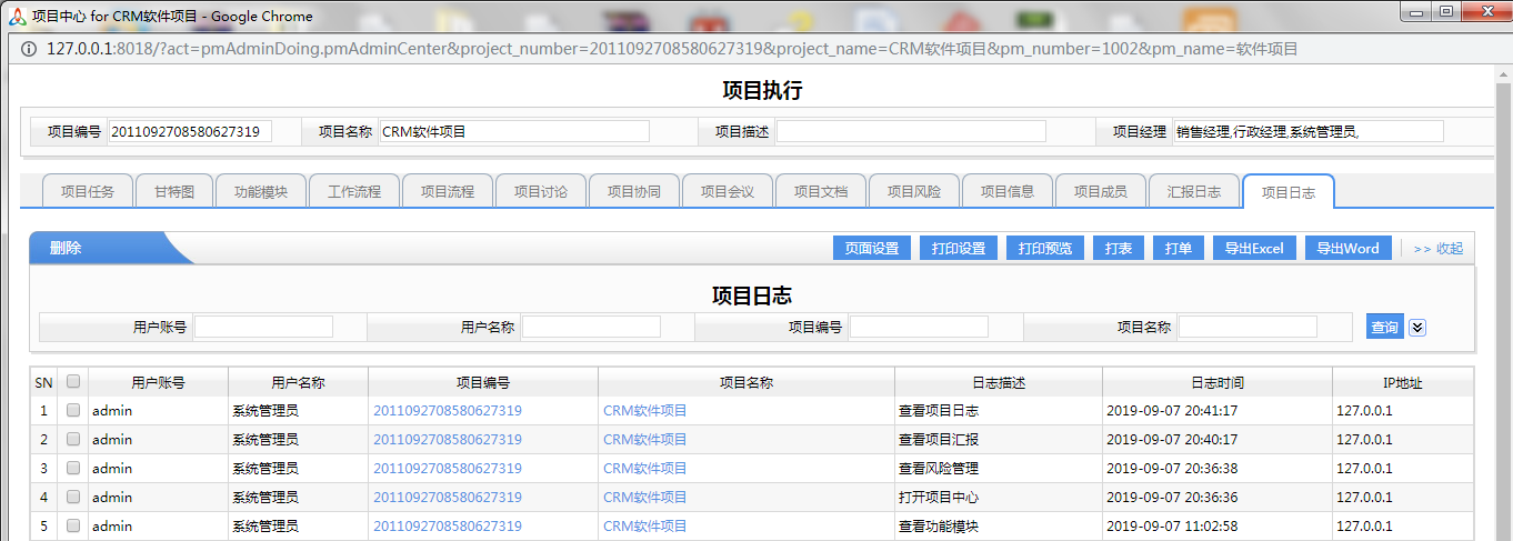 11)、项目信息 就是查看项目信息的内容,也就是项目模板设计的表单的内容,这里就可以清楚看到该项目的有哪些属性?这样更方便的了解项目的基本情况;这里不用什么操作,只是查看而已 12)、项目成员 查看该项目有哪些成员组成?陈远的联系方式,如果项目需要沟通的时候,也可以在这里面找到对应的成员,找到联系方式,就可以及时的沟通,以及时时看到该成员的一个考核得分数,实时了解该成员在项目中起到的作用;这里不用什么操作,只是查看而已 13)、汇报日志 汇报日志就是在项目任务中进行汇报的内容,不管哪一个汇报的任务都在这里集中展示,集中的看到汇报人员的汇报情况;这里不用什么操作,只是查看而已 14)、项目日志 查看有哪些人访问过此项目,操作过此项目的某些项,都有详细的日志,表示有哪些成员看过该项目的内容?那么这样就可以清楚的知道项目成员的动态