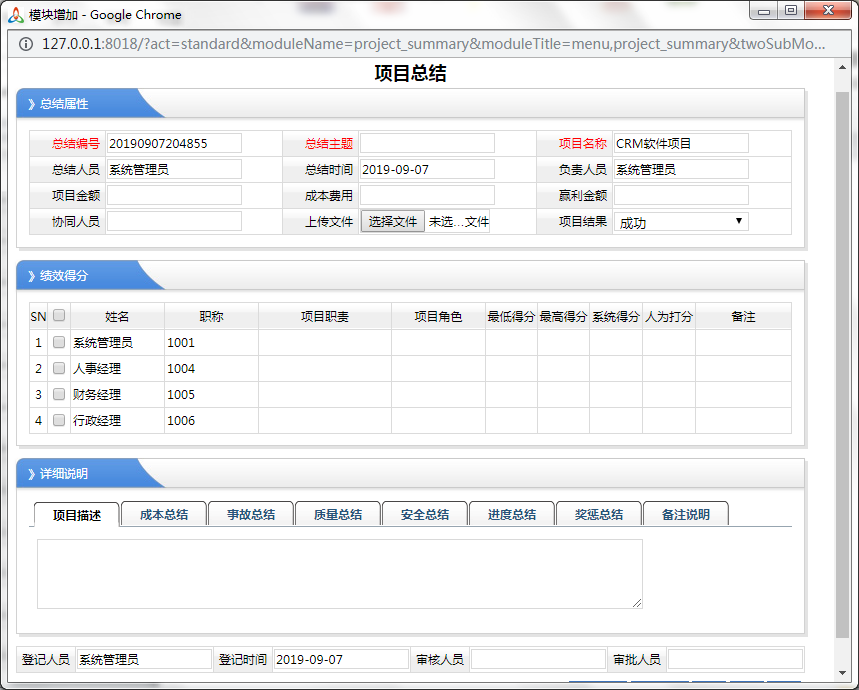 总结,项目中心主要是体现项目过程管理的每一个细节,以及项目实施中方便处理,记录项目过程中的事情,也方便管理者对此项目进行一个集中的管理,查看和操作都在项目中心集中完成 那么,如果一个项目完成了以后,那么我们怎么结束项目?只要我们觉得项目已经完成,那么我们就要对项目进行一个总结,以及对项目进行一个考核打分,项目总结完成以后,就标志着子项目已经完成,那么还要再看到此项目的内容,就要在竣工项目里面才能够看到了,在办项目是看不到的 4、项目总结 项目总结就是对项目进行一个最后的总结,也标志着对项目完成的结束的操作,那么我们在项目总结里面点击增加就可以打开项目总结的界面,如下图所示